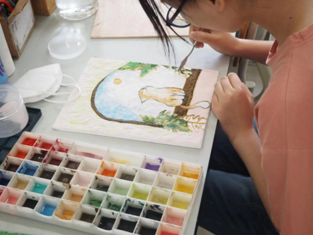 郭大师现场教同学们制作沙画。郭大师介绍到,沙画根据制作工艺的不同,分为三种,分别是景泰蓝掐丝彩沙画、立体沙画及固态沙画。同学们先在特制木板上设计出自己喜欢的图案画出草图,然后粘铁丝,倒彩砂,调沙,最后放阴凉处阴干即可,同学们在穿梭的时间中交织出一幅幅栩栩如生的非遗沙画。