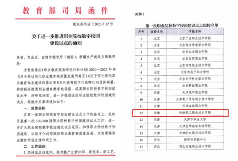 2023年5月26日教育部职业教育与成人教育司发布《关于进一步推进职业院校数字校园建设试点的通知》,其中公布了第一批职业院校数字校园建设试点院校名单,我院在列。