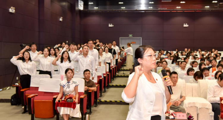 从教30年教师代表王丽云领誓,2023年新入职教师宣誓。