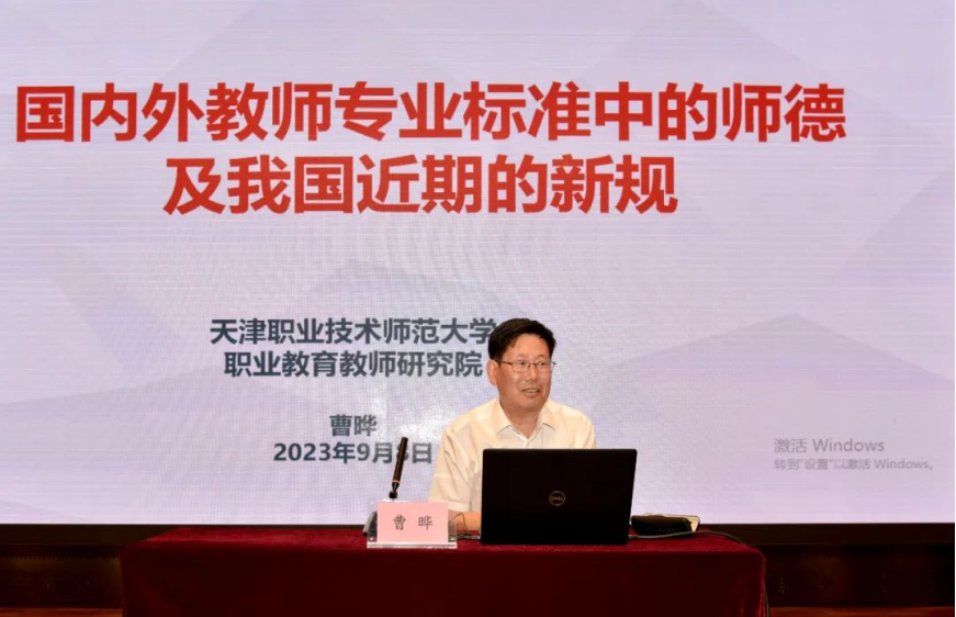 大会邀请了原天津职业技术师范大学职业教育教师研究院院长曹晔教授,为我们做题为《国内外教师专业标准中的师德及我国近期的新规》的师德师风专题讲座。
