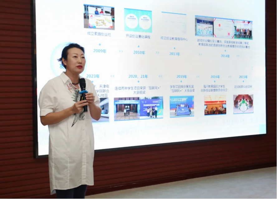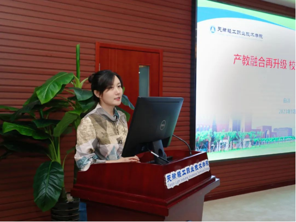 校企合作与培训部主任白洁作题为《产教融合再升级 校企合作新发展》的专题报告,分别从学院基本情况、学院双高建设情况、产教融合校企合作情况、校企合作案例分享及未来展望五方面内容来分享。