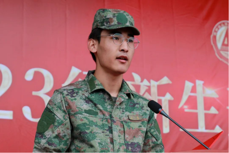 军训教官代表王一鸣发言,他表示在接下来的军训期间,希望同学们能强健体魄,联络情感,升华思想,同时教官也会以身作则,为同学们树立良好的榜样。