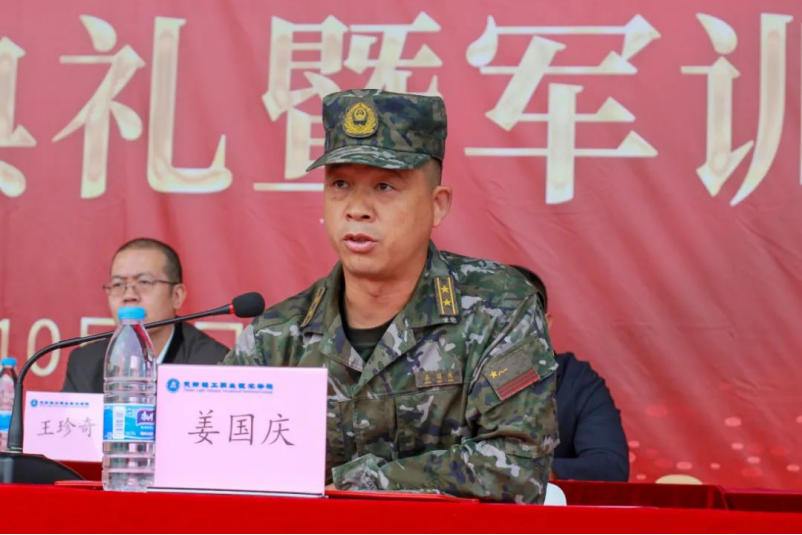承训部队武警机动第4支队副参谋长姜国庆讲话,他表示通过军训,同学们不仅可以学到基本的军事知识和技能,还可以培养热爱祖国、热爱人民的爱国主义精神;英勇顽强、坚韧不拔的革命英雄主义精神;团结友爱、互帮互助的集体主义精神。他也希望参训的同学们严守纪律,做到令行禁止,一切行动听指挥,努力锤炼意志品质和精神毅力,为走好今后的人生道路上好第一堂课。