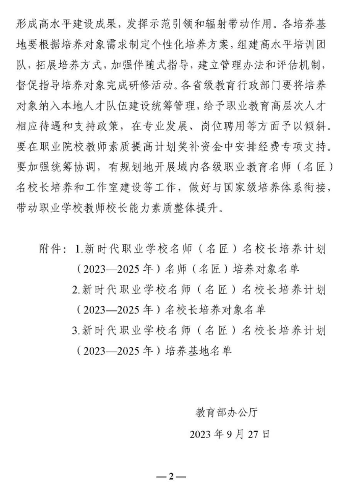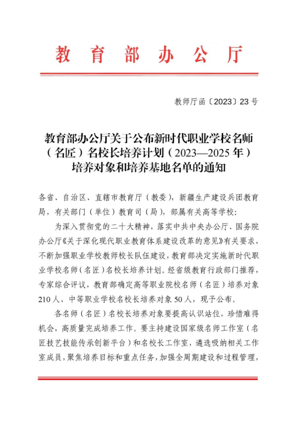 近日,教育部下发了《关于公布新时代职业学校名师(名匠)名校长培养计划(2023-2025年)培养对象和培养基地名单的通知》(教师厅函〔2023〕23号),我院电子信息与自动化学院院长姚嵩教授入选名师(名匠)培养对象名单。