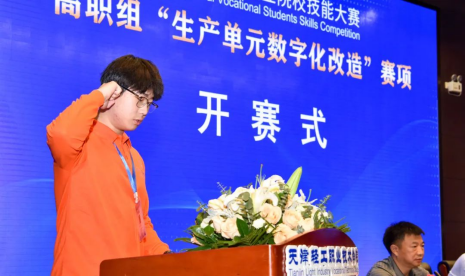 裁判员代表、安徽职业技术学院智能制造学院副院长桂树国和参赛选手代表、佛山职业技术学院潘超伟分别代表裁判员和参赛选手宣誓后,由全国职业院校技能大赛天津赛区执委会副主任张仁刚宣布开赛。