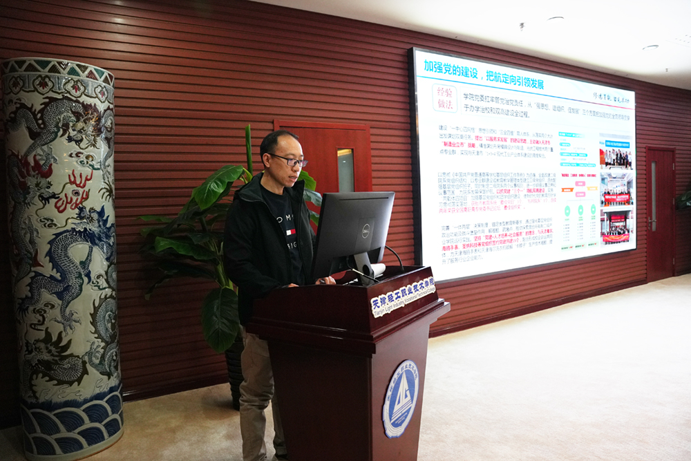随后,新利18平台组织部副部长刘彬,从党组织建设、党建共建模式等方面对学院党建工作经验进行了介绍。刘彬副部长讲到,学院党委要扛起管党治党责任,从“强思想、建组织、促发展”三个方面把加强党的全面领导贯穿于办学治校和双高建设全过程。首先,学院建设“一中心四网格”思想引领和“三全四维”育人体系,提出“以服务求发展”的战略思路,主动融入天津市“制造业立市”战略。其次,实施“两载体四项目”加强基层党组织和团学组织建设,连续两年荣获全国高职高专党委书记论坛“最佳组织奖”。最后,坚持“党建+人才培养+社会服务”的理念,与天津海尔、海鸥手表、圣纳科技等党组织签约党建共建15个,联合形成校企命运共同体。