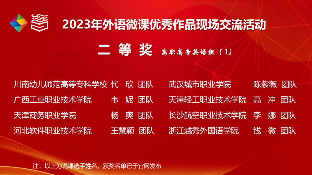 此次外语微课作品征活动共有来自29个省(自治区、直辖市)524所院校的1160件微课作品。全国优秀作品现场交流环节,选手们通过微课作品展示、说课两个环节,对教学理念和富有创意的微课设计进行阐述。我院教务部外语教研室高冲、李伟老师的外语微课作品荣获全国优秀作品二等奖。