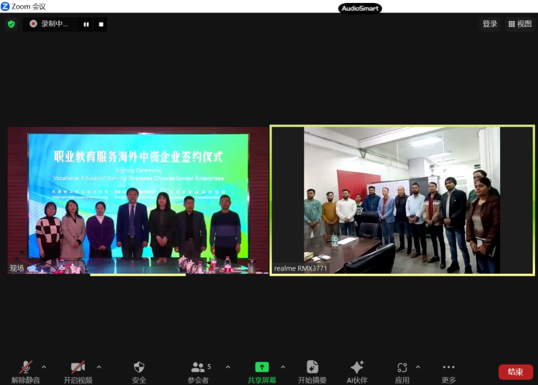 最后,两校与印度MCM通讯设备有限公司采用线上线下相结合的形式共同举办“职业教育服务海外中资企业”签约仪式,印度MCM通讯设备有限公司总经理李格及企业印度员工代表于线上参加了仪式。仪式上,三方共同签署了《中文+职业技能培训项目合作协议》。