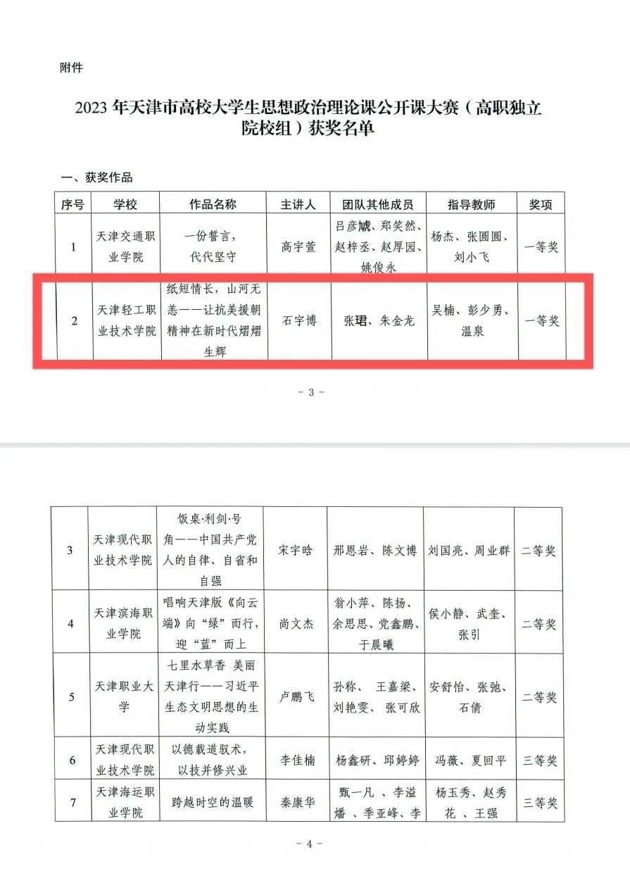 为坚持不懈用习近平新时代中国特色社会主义思想铸魂育人,提高思政课的针对性和吸引力,引导学生深刻领悟“两个确立”的决定性意义,增强“四个意识”、坚定“四个自信”、做到“两个维护”,坚定不移听党话、跟党走,市教育两委组织开展了以“新思想引领新征程·新青年建功新时代”为主题的2023年天津市高校大学生思想政治理论公开课大赛。经过初赛、复赛、决赛三个环节,我院学生石宇博、张珺、朱金龙的参赛作品《纸短情长 山河无恙——让抗美援朝精神在新时代熠熠生辉》脱颖而出,荣获高职独立院校组一等奖,指导教师吴楠、彭少勇、温泉获得“优秀指导教师”荣誉称号。
