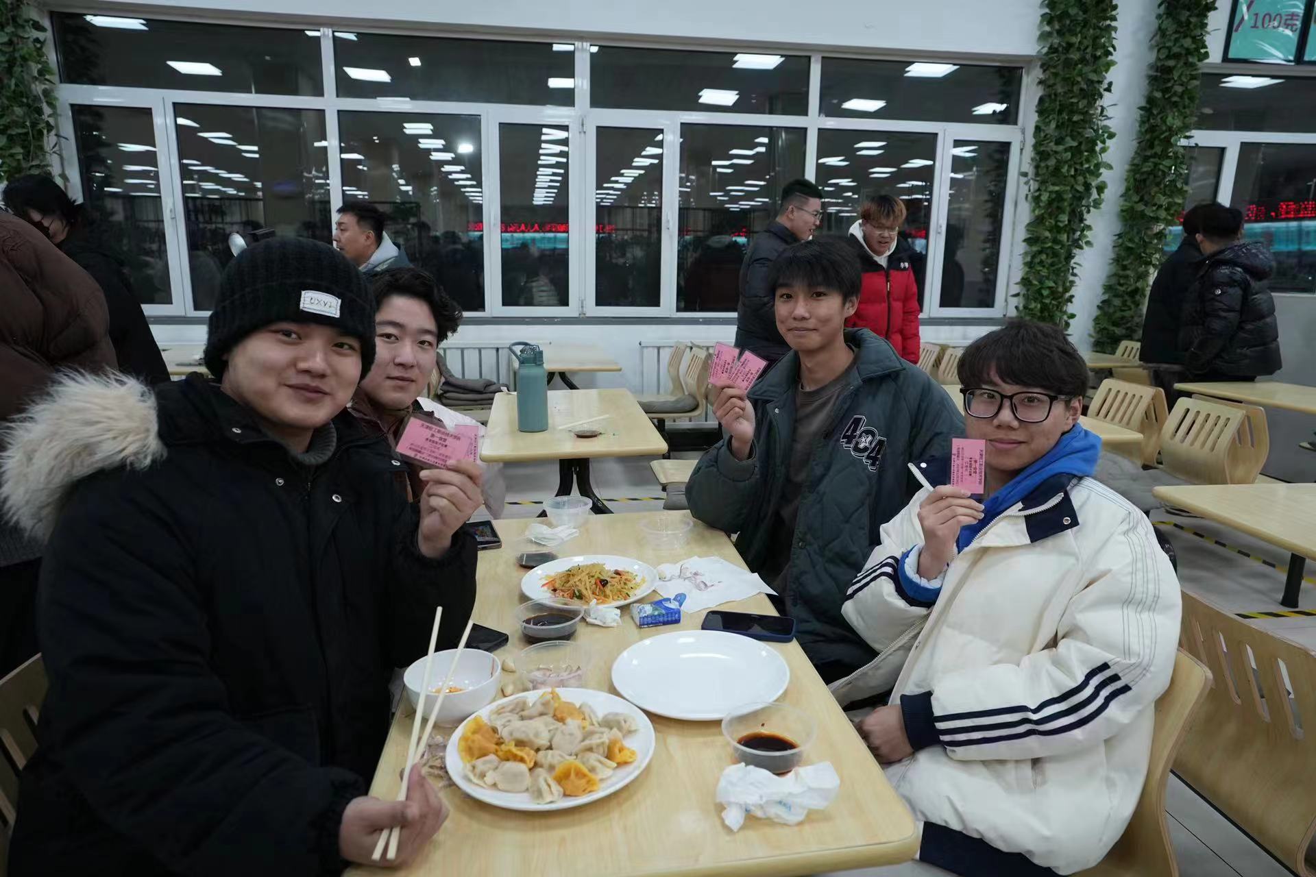 比赛过后,我们的志愿者同学和大厨师傅一起为参赛选手煮饺子、发奖券。热气腾腾的饺子端上桌,搭配着食堂为大家免费准备的大蒜、辣椒、香醋、小菜,让同学们在大雪过后的日子里感受到学院大家庭的温暖,感受到传统文化节日的氛围,培养同学们团结协作的团队意识,也让同学们知道了一餐一食来之不易,更应珍惜粮食,杜绝浪费。在今后的生活中,后勤基建部将继续做好师生的各类服务保障工作,尽可能为师生提供更多欢乐的活动,让大家生活在一个健康、幸福、快乐的校园环境里。