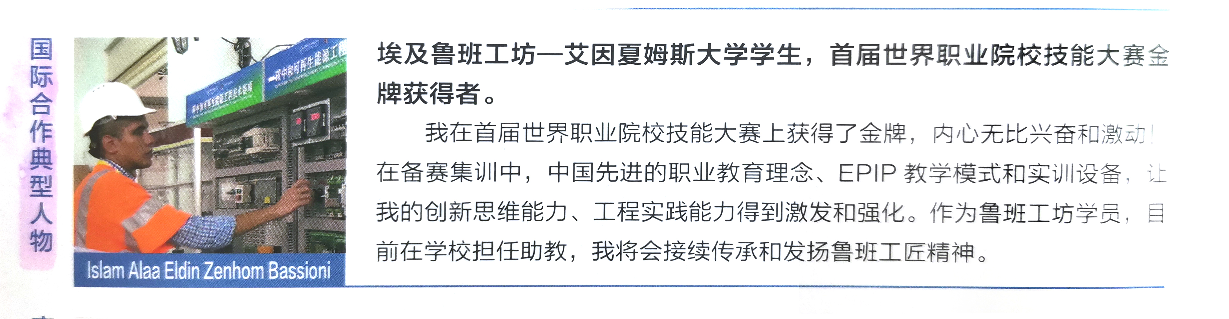 入选国际合作典型人物|首届世界职业院校技能大赛团体金牌获得者,埃及鲁班工坊——艾因夏姆斯大学学生Islam Alaa Eldin Zenhom Bassioni入选“国际合作”典型人物,并在《2023中国职业教育质量年度报告》封底予以展示。