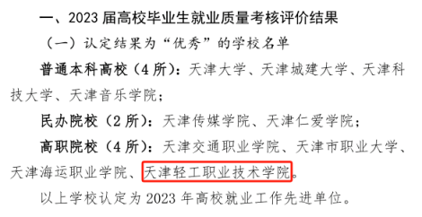 2023年12月29日,市教育两委下发《关于公布2023届高校毕业生就业质量考核评价结果及2024届高校毕业生就业质量考核评价指标的通知》,学院在天津市2023届高校毕业生就业质量考核评价中认定结果为“优秀”,同时被认定为2023年高校就业工作先进单位。