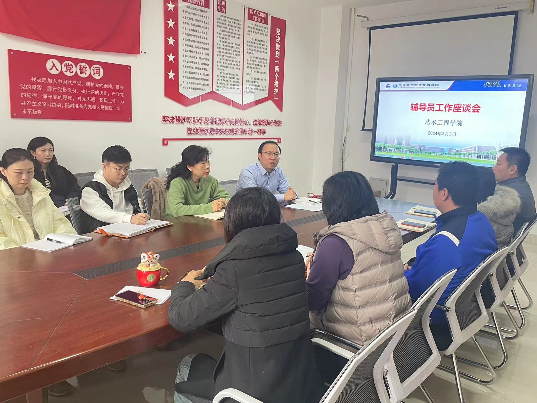 为全面了解辅导员工作情况,提高辅导员队伍的职业素养和工作能力,3月5日上午,学院党委副书记、副院长李子铮与党委学生工作部部长马延宏到艺术工程学院开展走访调研活动,并组织召开了辅导员工作座谈会。艺术工程学院党总支书记刘畅、实岗锻炼干部张津辅、吕鸿雁、学生科科长龚振华及专兼职辅导员参加本次会议。