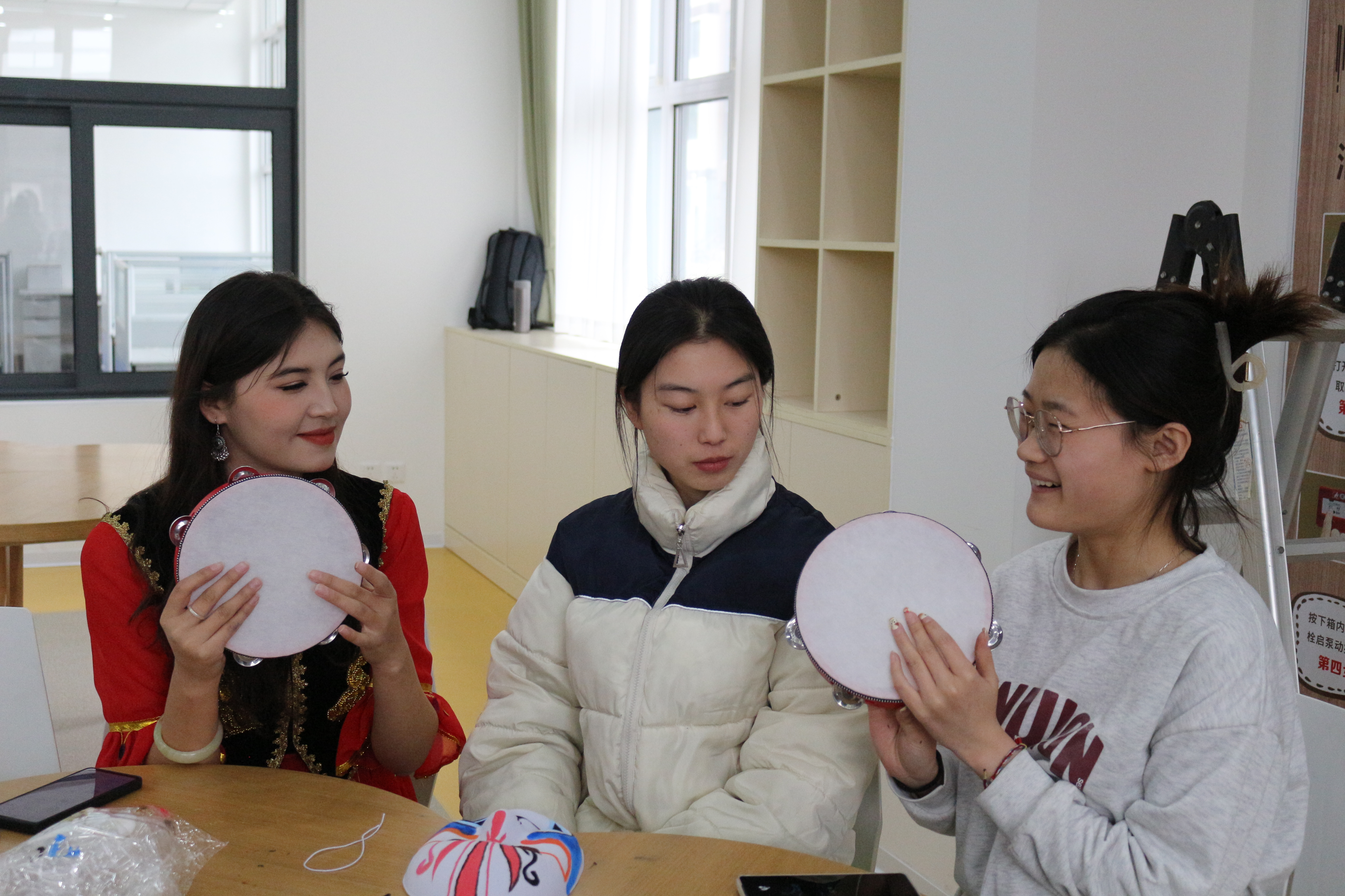 少数民族学生教汉族学生打手鼓,同学们在欢声笑语之下,一起感受鼓点音乐的魅力,也以此为友谊的纽带,留下了一份属于彼此的珍贵回忆。