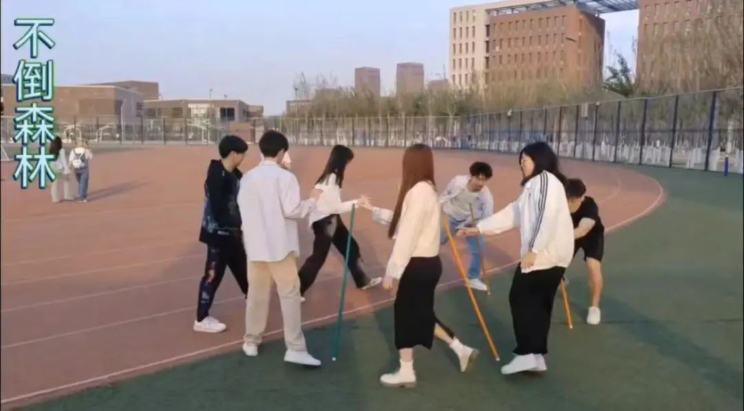 此活动比赛规则:所有队员拿一根不到森林的道具管子,围绕成一个圈,两人之间的距离相隔1米左右,用右手掌心抵住一端,另外一端立于地面。听到口令之后,手离开自己的管子,按照顺时针方向去按住前面那个队员的管子,保证管子不能倒地,倒地则需要重新开始。完成固定的次数则算成功。