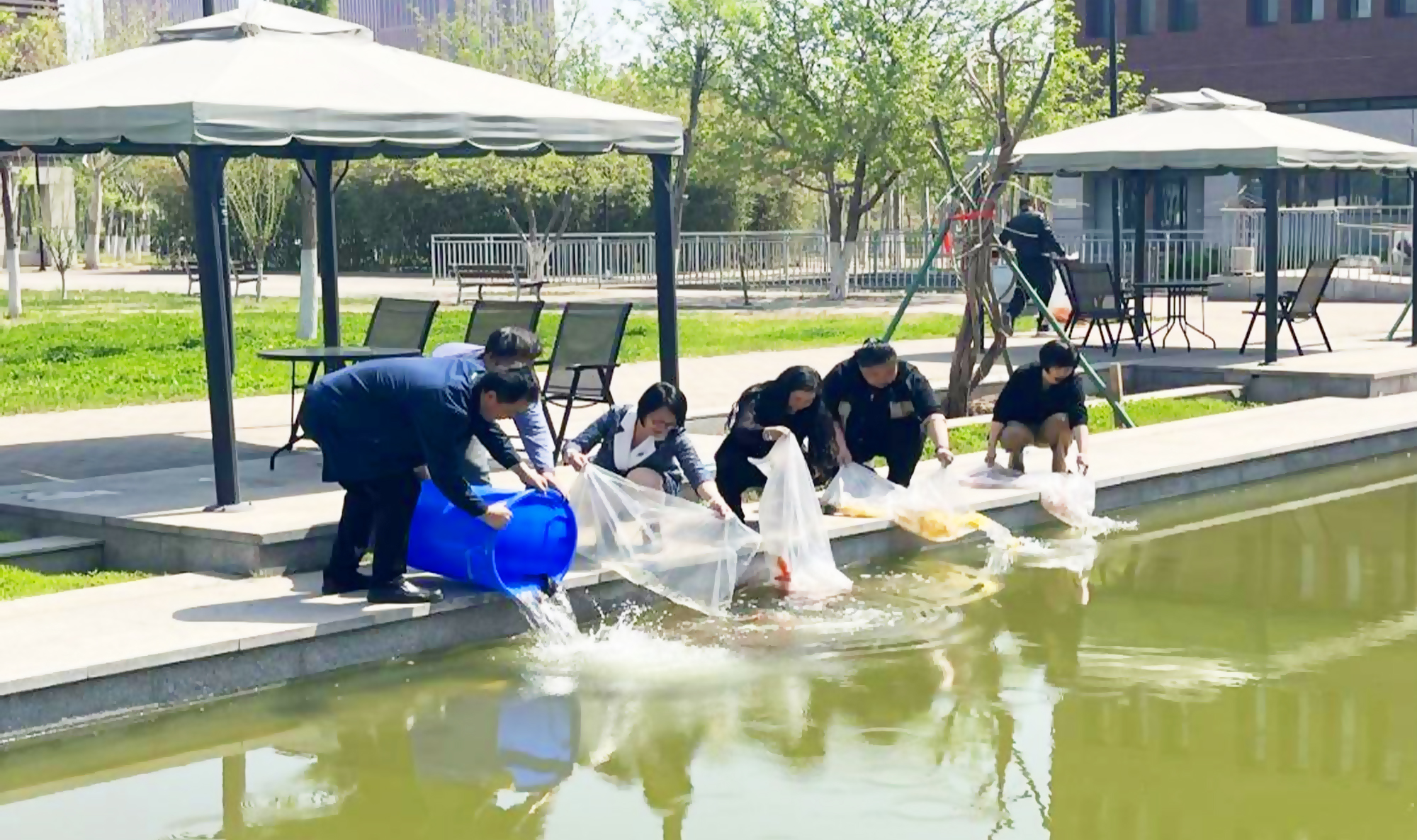 为打造绿色校园,丰富校园文化,在廉洁文化长廊亲水平台投放200尾锦鲤。锦鲤在生物学上属于鲤科,嗜吃浮萍、蓝藻等水生植物,有较强的水体净化能力,有“水中活宝石”的美称。本次锦鲤的投放不仅净化了水质,而且进一步提高了水体的观赏性。