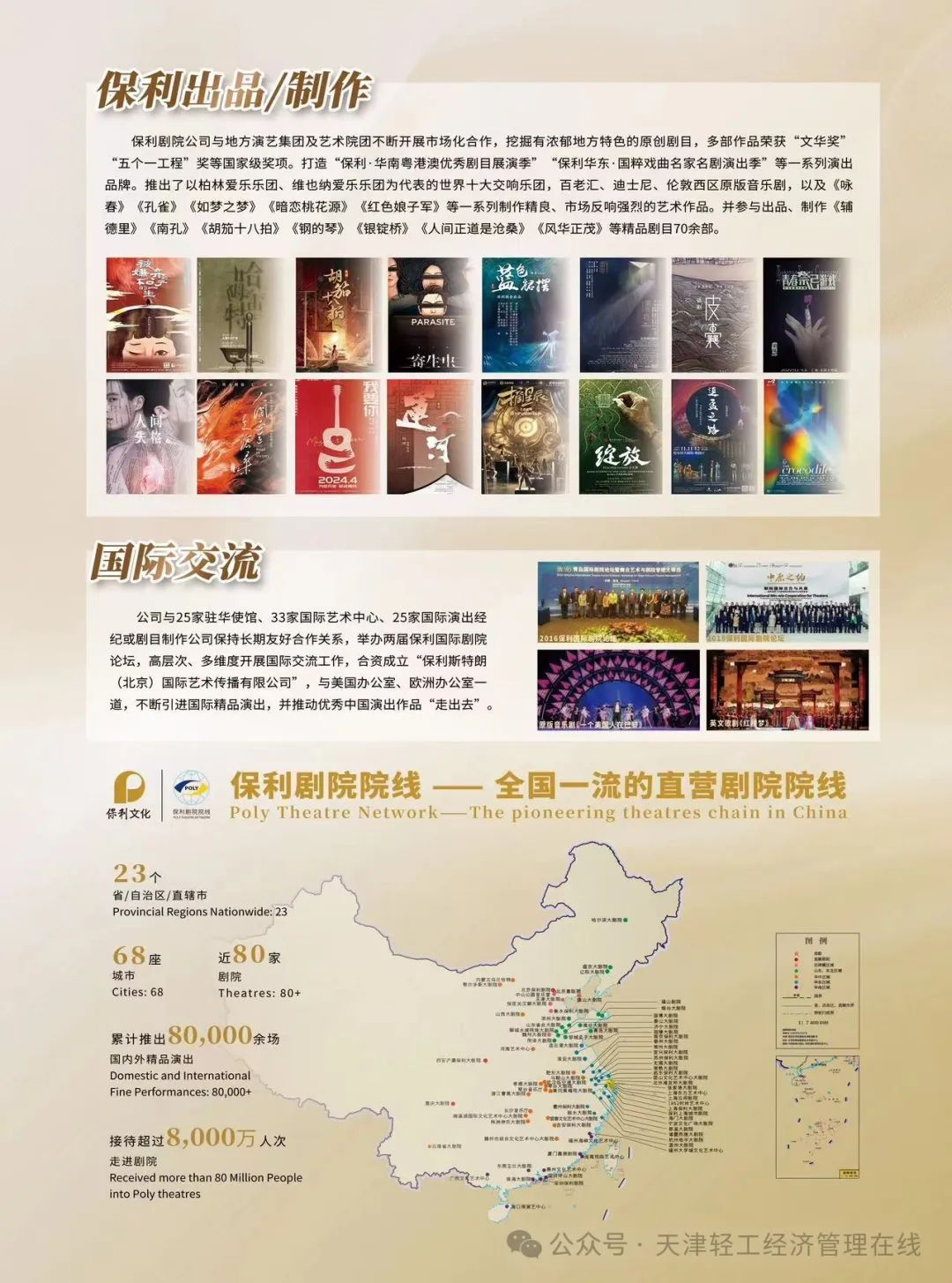 天津保利剧院管理公司隶属于北京保利剧院管理有限公司,是经天津市工商行政管理局于2017年11月14日批准注册、由文化主管部门批准经营演出及经纪业务的文化央企。公司以现代企业制度和先进的质量管理为标准、以“专业水平高、管理标准高、服务品位高、经营水平高、社会形象高”为管理目标,凭借保利剧院在国内的品牌优势在天津打造文化产业发展平台,促进天津文化市场发展。