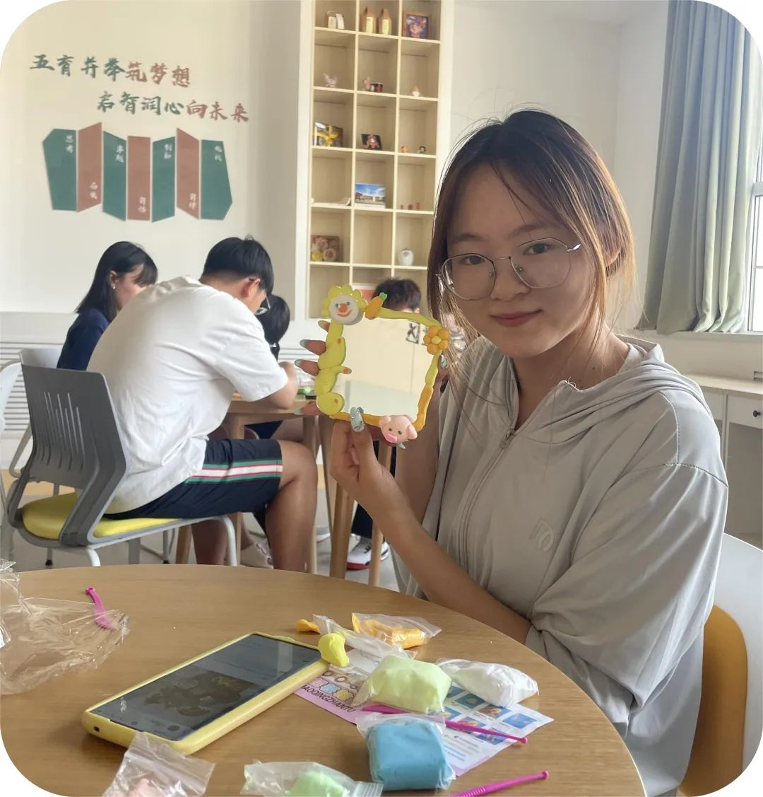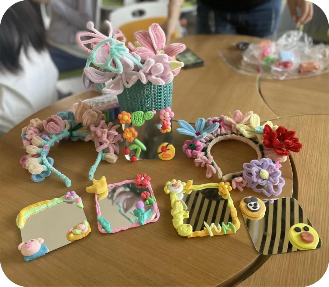 在“自由创意黏土镜”活动中,同学们经过长期反复的欣赏、操作、再欣赏、再操作的过程,锻炼了想象力、审美力、动手能力,手中的黏土镜俏皮生动、惹人喜爱。