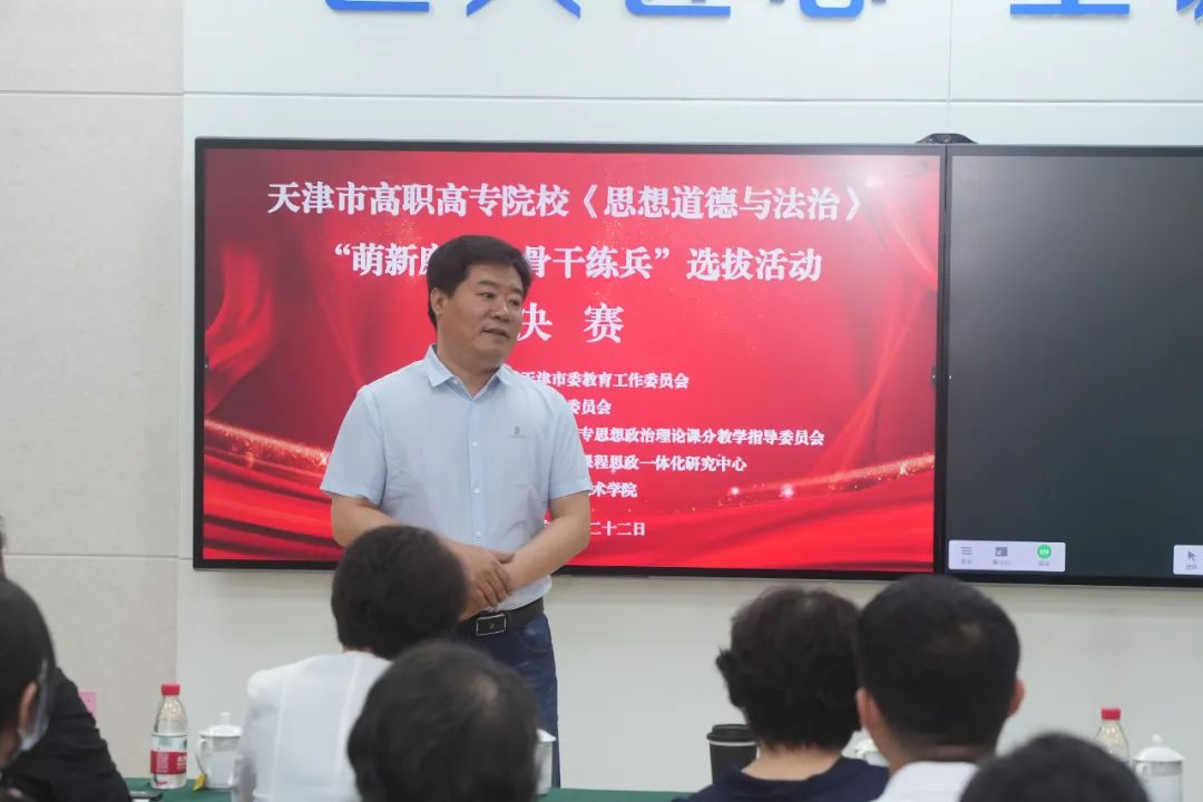 5月22日,由市教育两委主办,天津市高职高专思想政治理论课分教学指导委员会、天津市大中小课程思政一体化研究中心、新利18平台承办的天津市高职高专院校《思想道德与法治》课程“萌新磨课、骨干练兵”选拔活动市级决赛在新利18平台举行,市教育两委学生思想教育与管理处处长杨明,教育部全国高校思政课教指委高职高专分教指委副主任委员、全国高校思政课名师工作室负责人张泽玲,新利18平台副院长郑文柱等领导出席活动,市级思政课专家担任决赛评委,各高职高专院校马克思主义学院的负责人及思政课骨干教师莅临观摩,本次比赛由我院马克思主义学院副书记周显晶主持。