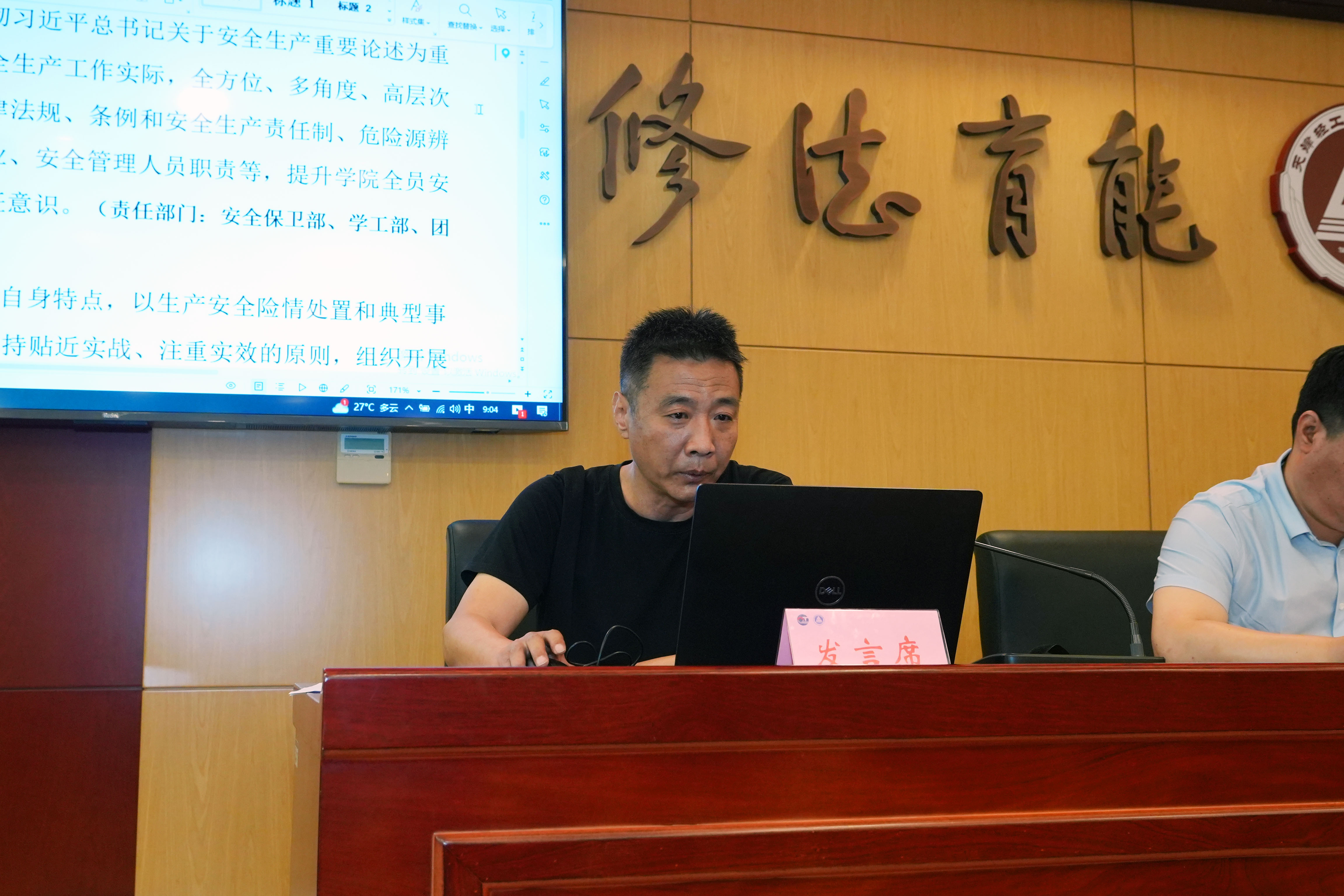 会议第一阶段由副院长郑文柱主持。安全保卫部按照上级文件要求,结合学院实际部署了安全生产月活动安排,明确了任务分工。副院长郑文柱强调了近期市教育两委、市国资委和渤轻集团等上级单位涉及安全工作的有关要求,通报了近期安全事件及警示提醒,并针对重点领域和重要时间节点,对学院下一步安全工作进行了重点提示。