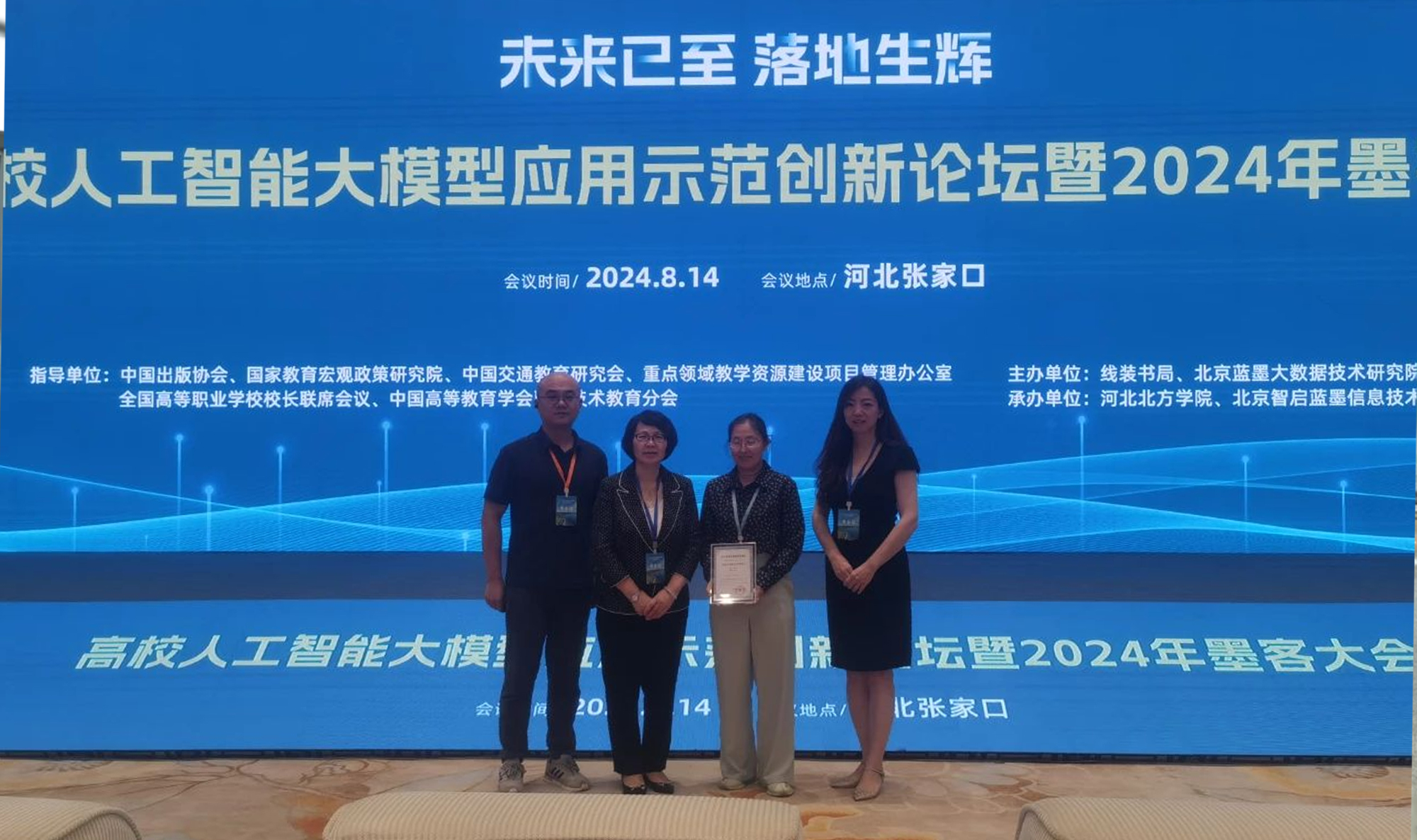 2024年8月13日至8月16日,由线装书局与北京蓝墨大数据技术研究院主办,河北北方学院与北京智启蓝墨信息技术有限公司承办的“高校人工智能大模型应用示范创新论坛暨2024年墨客大会”在河北张家口召开。论坛由北京蓝墨大数据技术研究院院长商桑主持。
