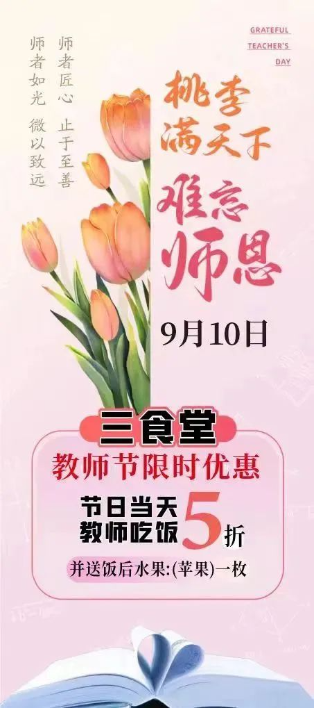 三食堂特为全校教师准备教师节优惠活动,所有教师9月10日在三食堂用餐可享受5折优惠并赠送苹果一枚。