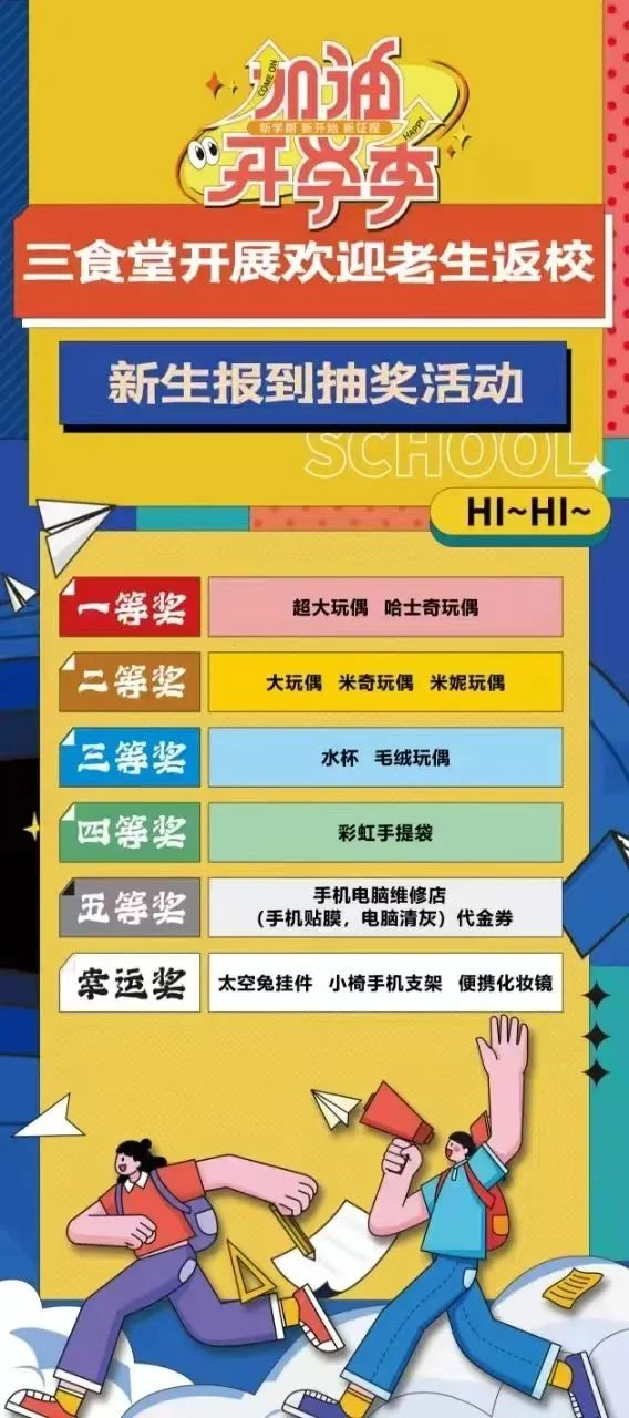 三食堂推出奖池抽奖活动,学生抽取抽奖箱内福利球参与活动,福利包括:一等奖赠送超大可爱玩偶,二等奖赠送米奇米妮等大玩偶,三等奖赠送水杯及毛绒玩具,四等奖赠送彩虹谷手提袋,五等奖赠送校内手机电脑维修点代金券可用于手机贴膜电脑清灰等,特别奖为餐厅内35种菜品均参与0元免单,幸运奖赠送太空兔挂件、手机支架、便携化妆镜等。