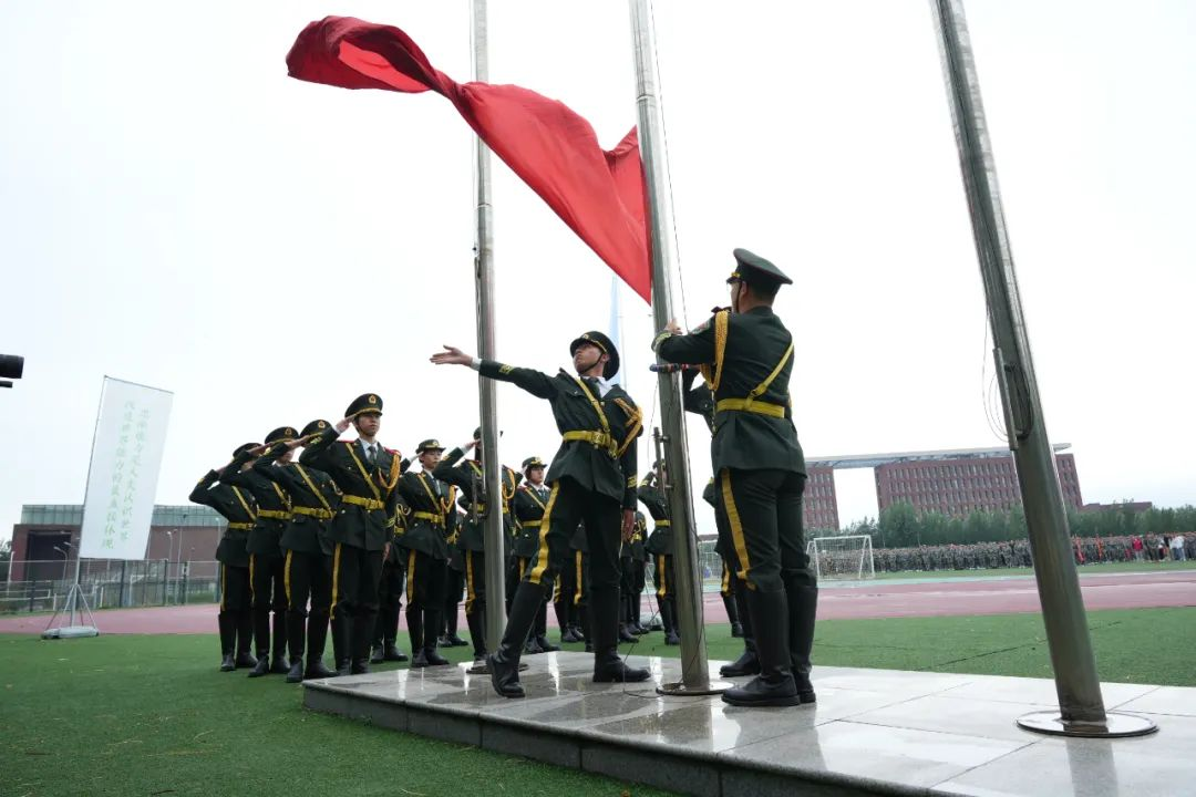 国旗护卫队整齐划一,踏着铿锵有力的步伐护卫国旗入场,伴随着激昂的《义勇军进行曲》,五星红旗冉冉升起,全体师生注目肃立、高唱国歌,我院2024级新生开学典礼暨军训开营仪式拉开序幕。