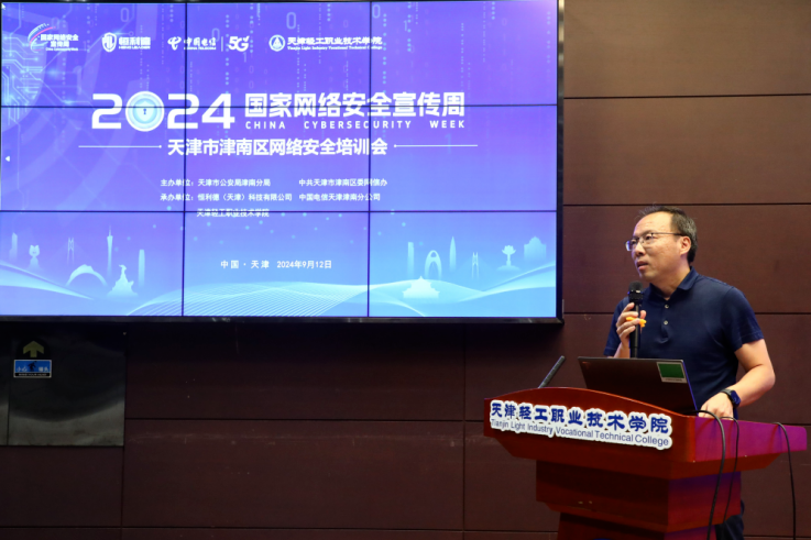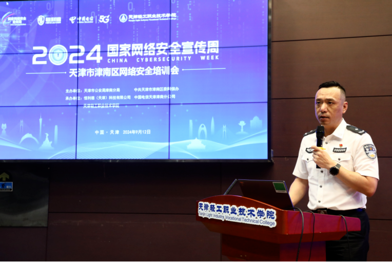 2024年9月12日,由天津市公安局津南分局、中共天津市津南区委网信办主办,新利18平台、中国电信天津津南分公司、恒利德(天津)科技有限公司承办的2024年天津市津南区网络安全培训会在我校顺利召开。天津市公安局津南分局党委委员、副局长杨光同志,中共天津市津南区委网信办胡宗平副主任,新利18平台党委副书记、副院长李子铮同志,中国电信天津津南分公司副总经理王军奎同志出席此次会议。全区百余家企事业单位、高校及我校教师代表、学生骨干共400余人参加此次会议。