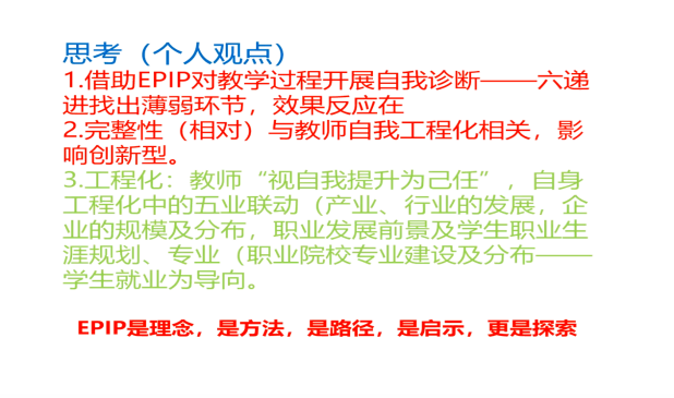 随后,6名天津市职业院校EPIP教师教育教学能力提升高级研修班学员教师分别作心得分享。杜志强老师立足新能源专业与EPIP结合分享心得体会,认为教师在工程化项目中应借助EPIP对教学过程进行自我诊断。马思宁老师结合EPIP的一宗、两核、三谛、四元、五观分享课程资源建设心得体会。赵慧老师基于EPIP的《数控加工技术》课程教学实践进行心得分享,认为基于岗课赛证和课程思政,应立足真实的工作场景、以实践应用为导向、工程实践为导引、培养职业与创新能力。宫宇航老师通过EPIP高研班学习后,创造性地将ChatGPT应用于鲁班工坊教学当中,并基于具体项目进行工程实践创新。杨苗老师围绕“EPIP+就新利直营官网首页入口电话”的生成逻辑、作用机理与实践路径阐述学习体会,阐述EPIP要激活现有诸要素的内涵与价值,认为课堂教学要达到知行合一、德技并修。徐建香老师立足就业与新利直营官网首页入口电话课程,分析传统教学模式、双元制教学模式、EPIP教学模式的差异与不同,并在此基础上进行课程设计。