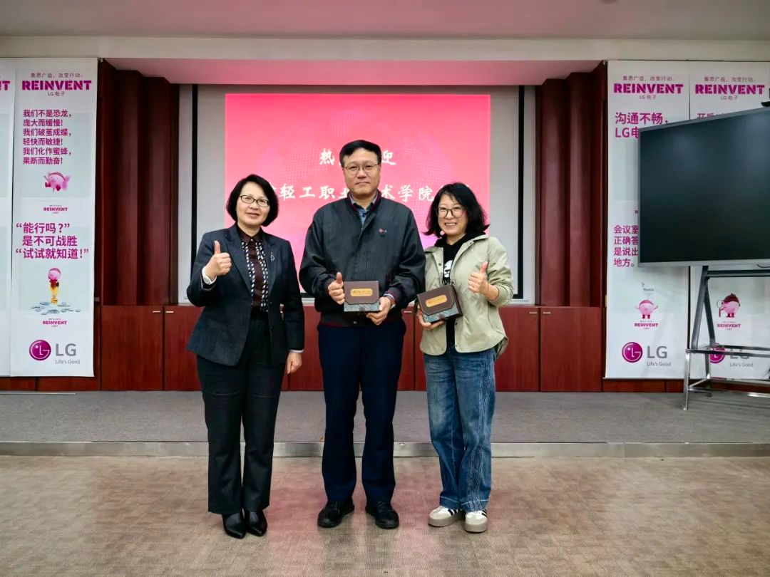 座谈中,朴毕求总裁对轻工学院一行访企拓岗表示欢迎,介绍了公司的发展历程,也通过轻工学院的发展进一步了解了中国职业教育,未来校企将深入合作,共同推动知识型技能型创新型产业工人队伍建设。胡云亮总经理介绍了轻工联机电公司对空调等设备维修维保典型案例,后期校企将共同开展轻工学院空调维修维保工作。李云梅院长介绍了学校情况,回顾了前期校企合作,表示后期将继续发挥各自优势,整合资源,共同促进人才培养、实习实践、就业创业、员工培训等方面的合作。李云梅院长向天津乐金电子(天津)电器有限公司总裁、副总裁赠送鲁班锁。