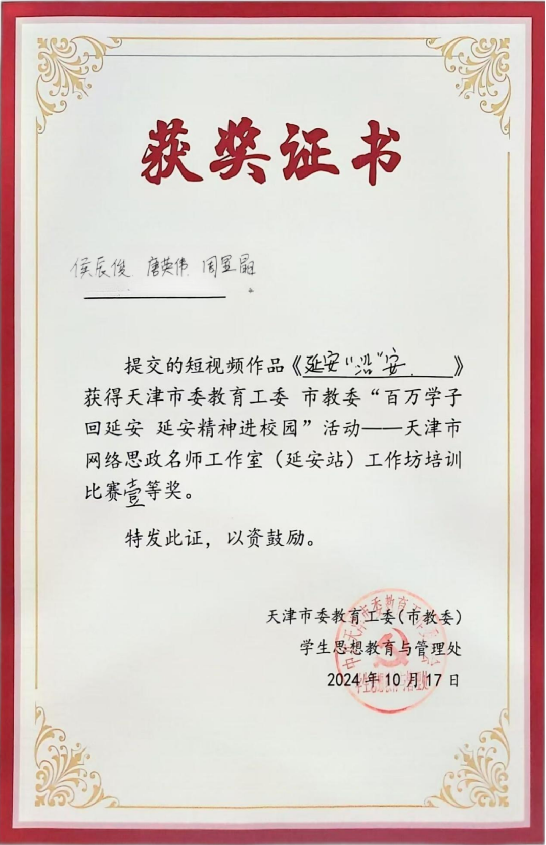 近日,学院“轻马在线”网络思政名师工作室积极参与市教育两委组织的“百万学子回延安 延安精神进校园”系列活动——天津市网络思政名师工作室(延安站)工作坊培训比赛活动。此次比赛设立一等奖一个,二等奖三个,三等奖八个,共有来自天津市大中小学在内的 37个单位、70名老师参加,现场制作参赛短视频40余个。由工作室教师侯辰俊、唐英伟、周显晶创作的短视频作品——《延安 “沿”安》荣获本次比赛一等奖。