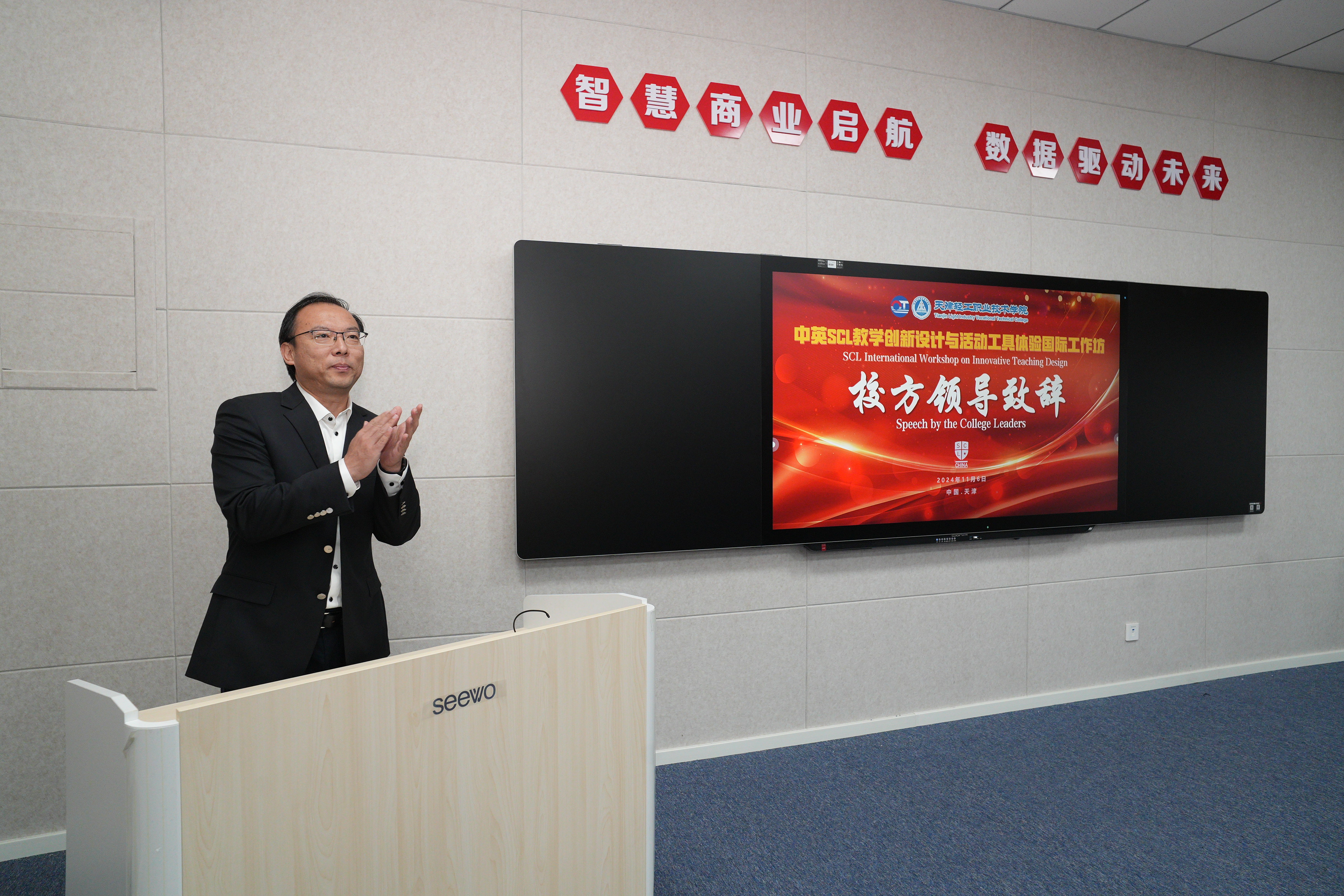 AQCET英国教育与教学质量控制协会高级会员、英国哈德斯菲尔德大学教授、英国国家高等教育委员会委员罗德•罗伯逊先生在致辞中介绍了英国教育与教学质量控制协会的发展,分享了自己针对SCL教学理念的独到见解和丰富经验,同时期待与学院35名骨干教师展开丰富多样的交流互动,推动SCL教学创新设计与学生活动体验教学方法在中国职业院校的普及和应用,加强中英教育教学互鉴互融。