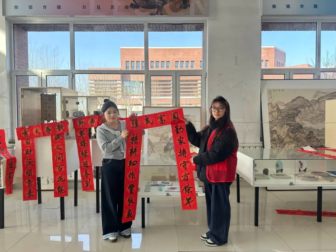 同学们拿到对联后,迫不及待地将其展开,轻声念诵着上面的文字。而那一幅幅苍劲有力、飘逸灵动的对联,恰似一条条无形的纽带,将文化的传承、校园的情谊紧紧相连,编织成一幅温馨而美好的校园新春画卷。
