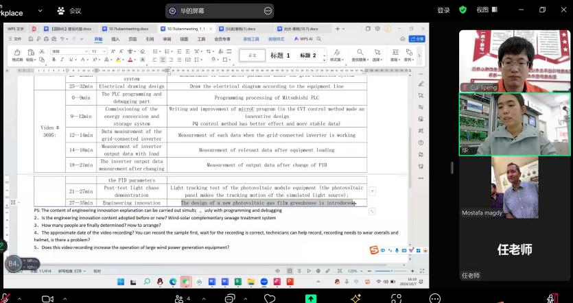 自世界职业院校技能大赛内容公布,两所院校一起研读最新的政策文件,深入研究赛程及技能要求,筛选拟参赛的选手,并由两所院校老师共同担任大赛指导工作。双方保持每天的定时联系,并确定了详细的备赛日程,经过讨论最终确定本次参赛选定的设备为埃及“鲁班工坊”新能源实训区已应用的风光互补发电系统和大型风力发电系统两个设备,围绕全球环境变化及能源供给结构的变化,确定以光伏及风电应用为主线的设计思路,整个备赛阶段,中埃双方通过线上研讨会、视频指导、微信等形式积极备赛。