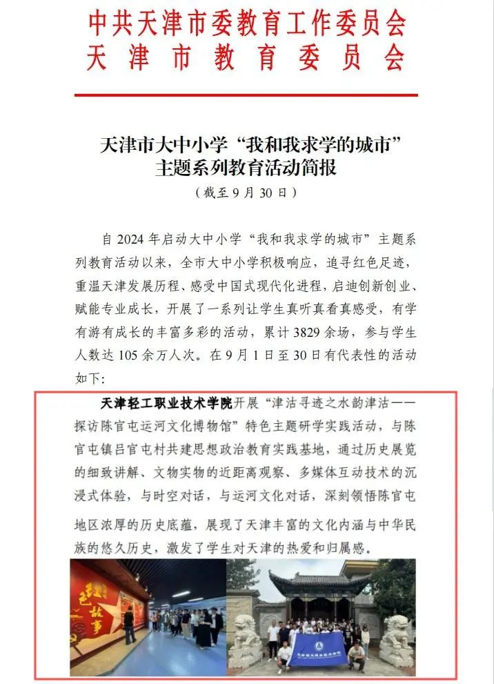 贯彻党的二十大精神及习近平总书记视察天津重要讲话精神,引导学生了解天津、热爱天津、建设天津,我院“我和我求学的城市”主题系列教育活动三次入选市教委简报。与陈官屯大运河博物馆、桂发祥等多地共建协同育人模式,建设6个思政实践基地,申报《轻新素质教育基地》入选2025年度学生综合素质训练基地推荐名单,推动思政教育高质量发展。