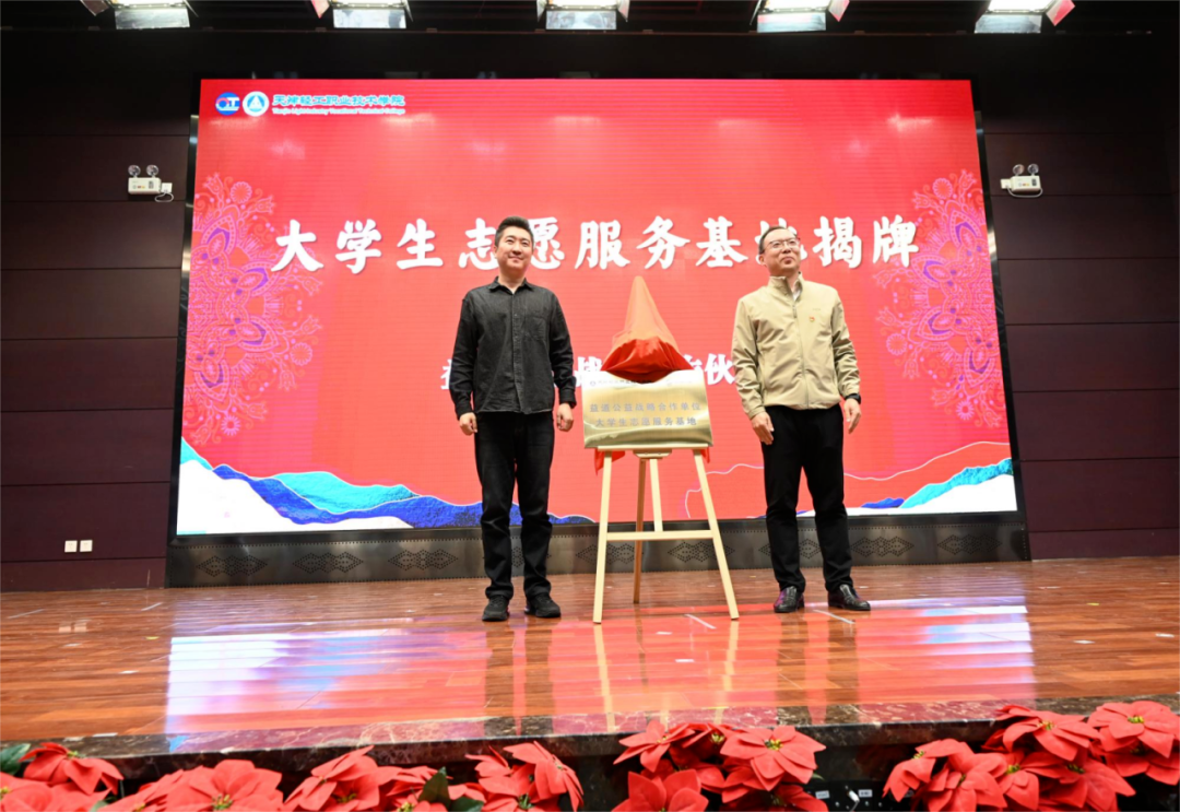 在本次校园文化节的开幕式上,学院与益道公益携手共建大学生志愿服务基地。天津市广播电视台主持人、益道公益发起人宋歌先生与学院党委副书记、副院长李子铮共同为大学生志愿服务基地揭牌,开启“校社协同”育人模式新篇章。