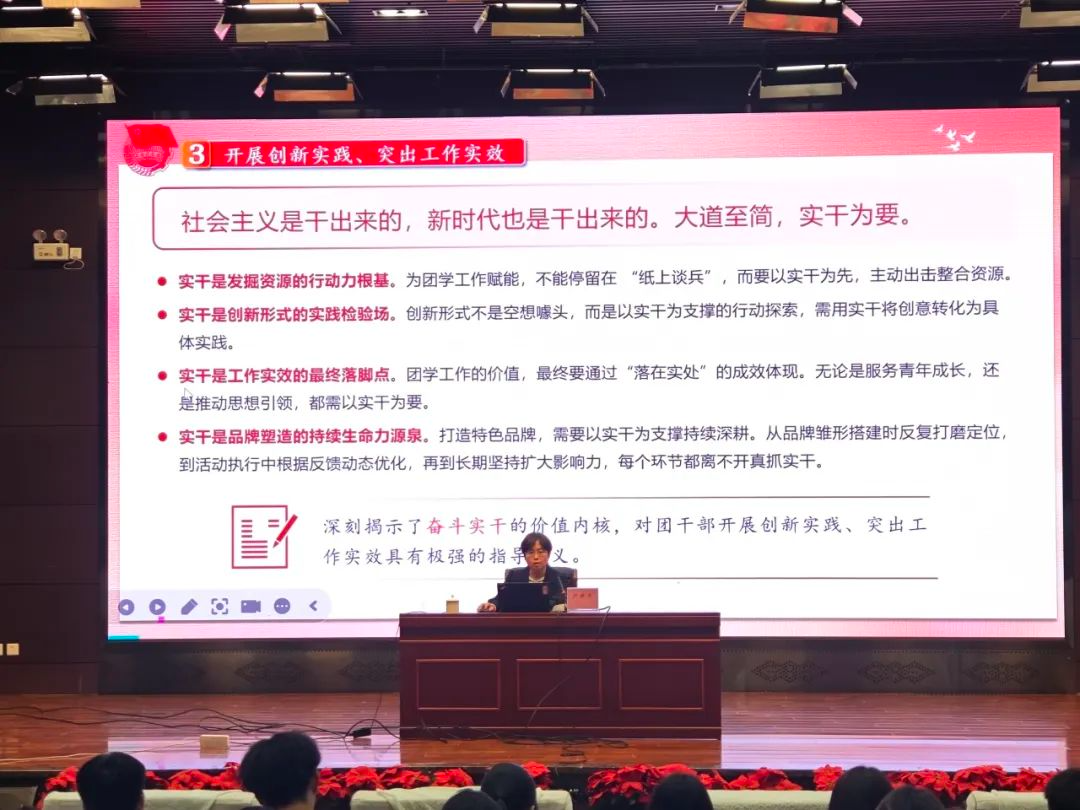 经济管理学院党总支书记、院长只井杰老师以《新时代团学干部的管理赋能与创新实践》为主题,为同学们分享了新时代团学干部如何提升自身素质、赋能团学工作、开展实践创新的实践经验。她通过生动的案例和深入浅出的讲解,让同学们深刻认识到作为新时代团学干部,不仅要具备扎实的专业知识和良好的组织协调能力,更要具备创新思维和开拓精神,勇于担当、敢于创新,为团学工作注入新的活力和动力。她鼓励同学们要积极投身团学工作实践,不断探索新方法、新路径,努力成为新时代团学工作的佼佼者。