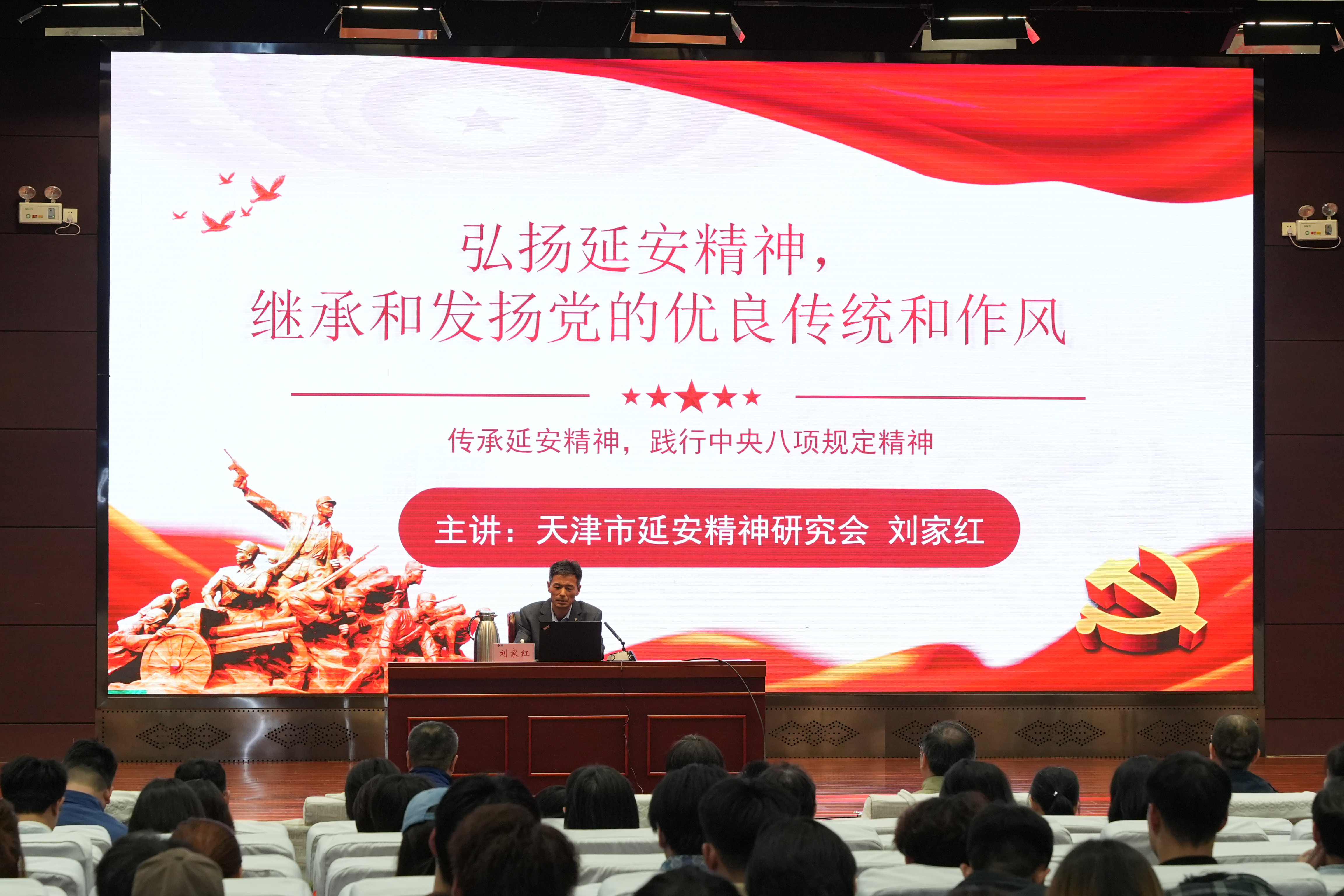 为贯彻落实党的二十大和二十届三中全会精神,深学深用习近平总书记视察天津重要讲话精神,切实把党史学习教育成果转化为铸魂育人的源头活水,进一步夯实党员干部的政治品格、激发青年学子的政治热情,为学院第二期“双高”建设注入强劲精神动能,近日,学院党委邀请天津市延安精神研究会宣讲团成员刘家红同志进行宣讲,学院党委副书记李子铮、各二级党总支书记、教师党员代表、学生入党积极分子和学生入党申请人参加。