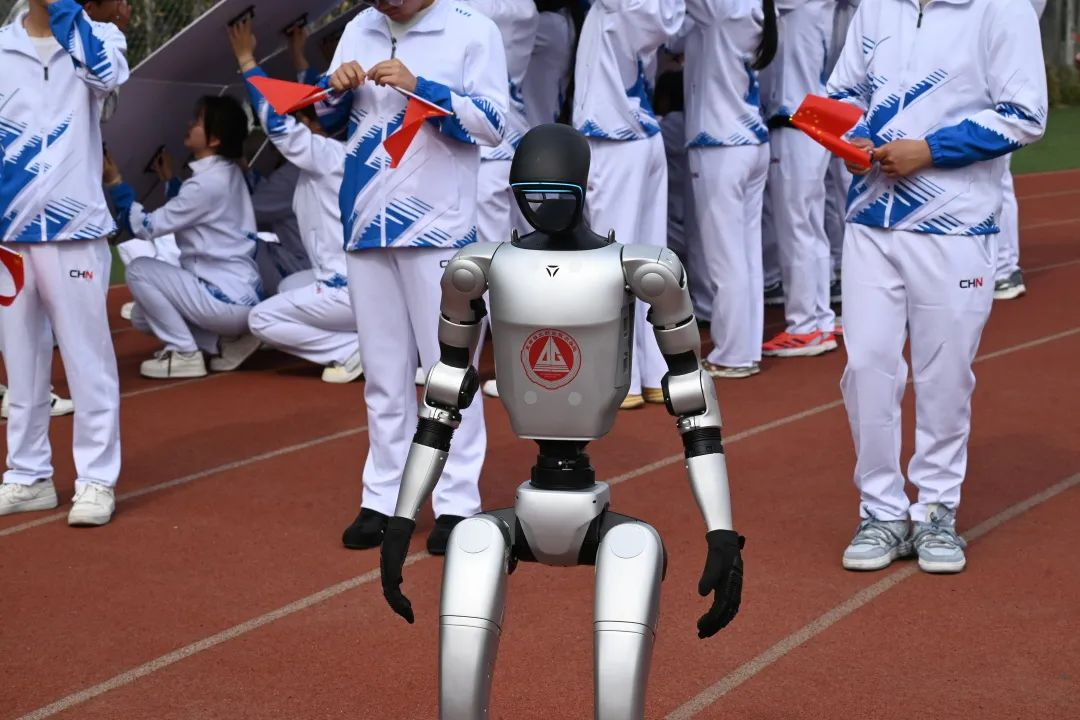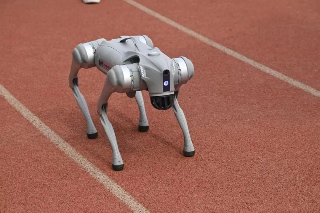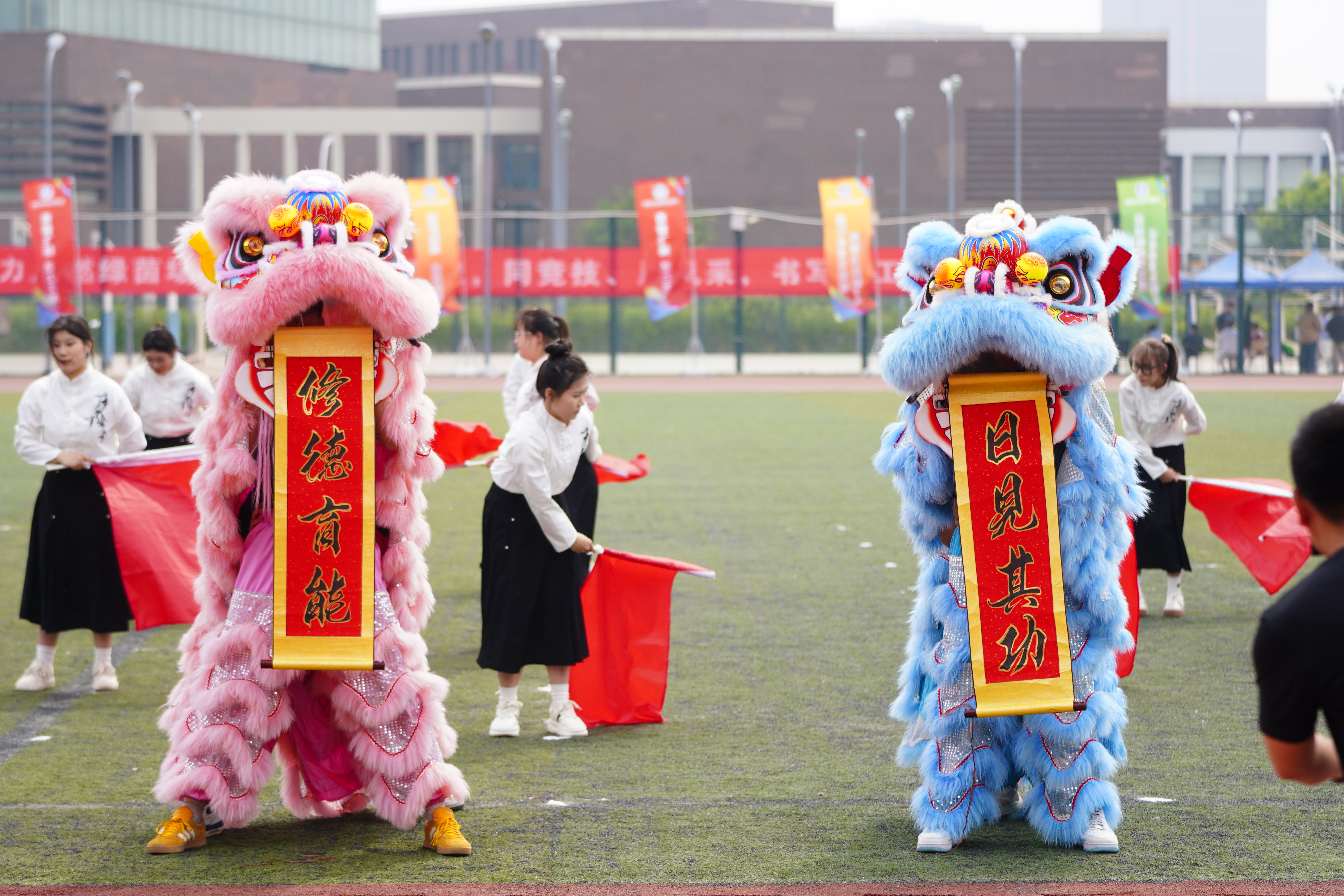 伴着激昂的运动员进行曲,国旗、校旗首先入场,旗海方阵、裁判员方阵、民族大团结方阵和各二级学院、学院运动队代表方阵迈着矫健的步伐依次入场,他们斗志昂扬的精神面貌博得了全场师生的阵阵掌声和喝彩。队伍中,我院与企业共同研发的人形机器人、四足机器狗等AI产品也一同上阵,做出炫酷动作,引发观众热烈欢呼。