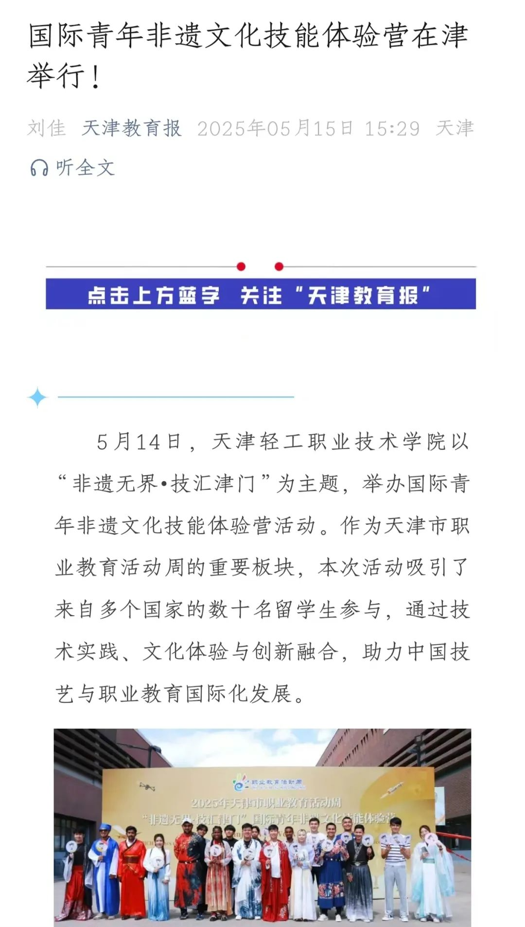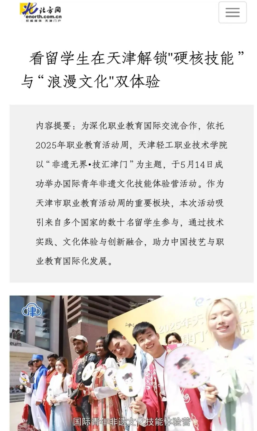 5月14日,新利18平台以“非遗无界·技汇津门”为主题,举办国际青年非遗文化技能体验营活动。作为天津市职业教育活动周的重要板块,本次活动吸引了来自多个国家的数十名留学生参与,通过技术实践、文化体验与创新融合,助力中国技艺与职业教育国际化发展。