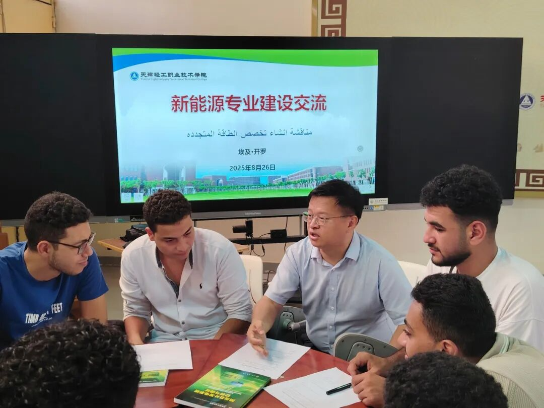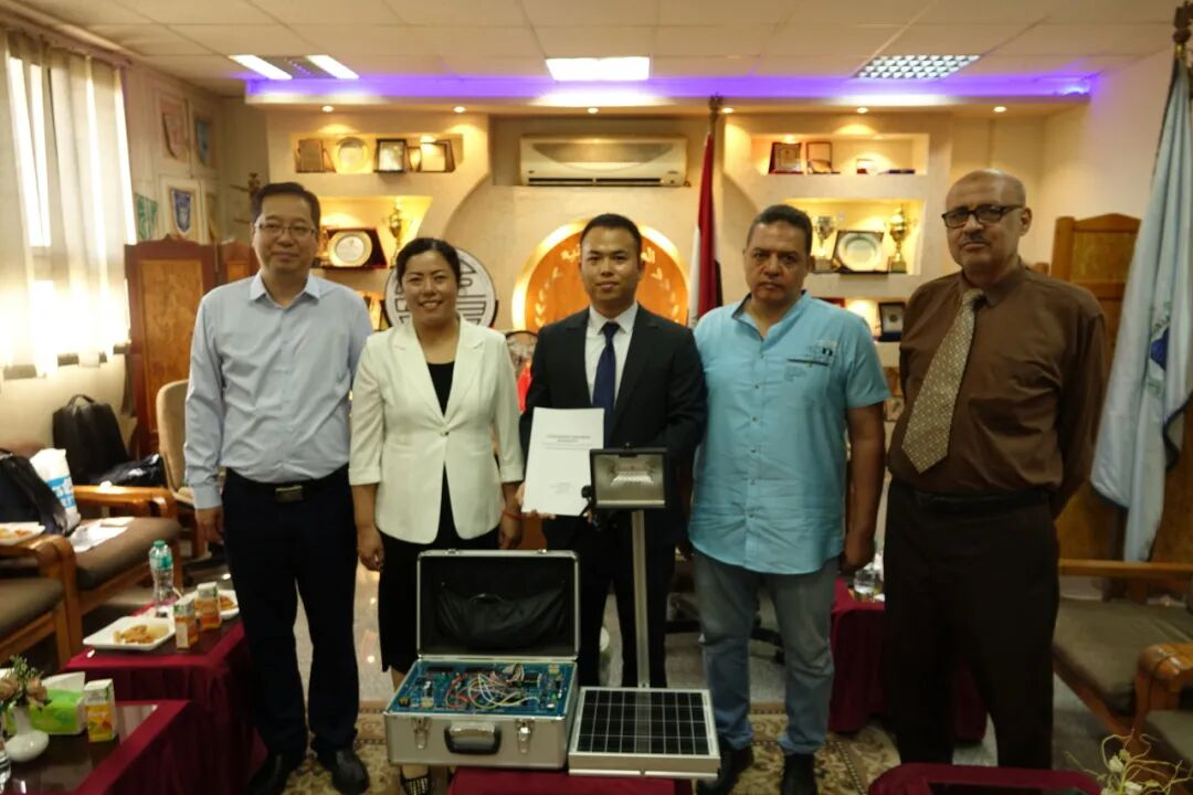 团组赴埃及鲁班工坊(开罗高级维修技术学校),与埃方领导及教师举行了工作会议。会议期间,双方围绕拓展新能源专业建设进行了深入交流,并就构建新能源专业中高本贯通体系的可行性、课程衔接、人才培养模式等关键议题展开探讨。会上,中方企业江苏伟创晶智能科技有限公司特别捐赠了一套光伏教学实训设备,进一步支持埃及鲁班工坊在新能源领域的教学与实训能力建设,同时院校与企业代表分别向埃方赠送了一系列教学资源。代表团实地调研了后续新建实训室的规划场地,就空间布局、设备配置和环境要求等与埃方交换意见,为后续建设做好准备。代表团赴鲁班工坊现有实训室,开展现场师资培训、教学研讨和学生交流活动。