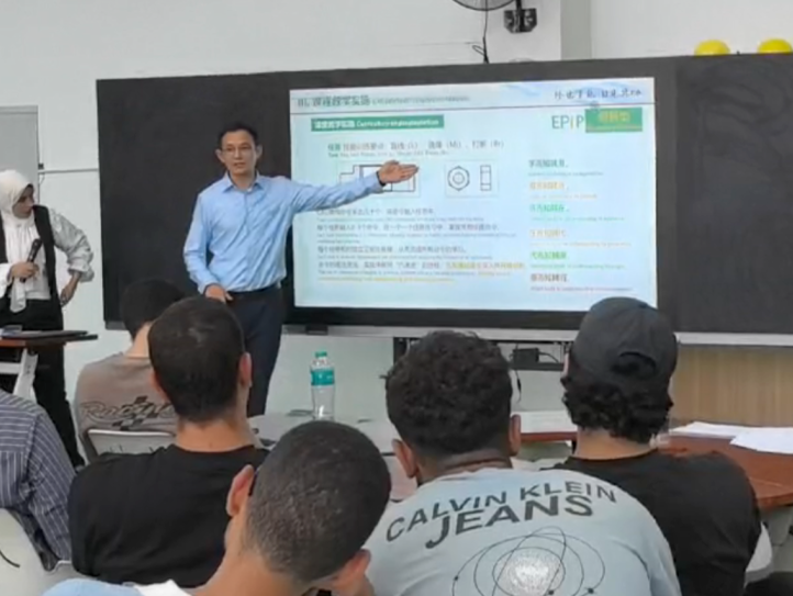 随后,代表团赴鲁班工坊实训基地,更新了实训室Logo及相关装饰等,详细查看了现有实训设备的运行状况和使用情况。在实训现场,中方教师向埃方教师开展了系统性的师资培训,内容涵盖EPIP在专业建设及课程开发层面的应用、设备操作规范及课程教学要点,并通过实际案例进行了手把手演示。同时,艾因夏姆斯大学学生代表汇报展示了自己的学习成果,现场气氛活跃,教学相长。