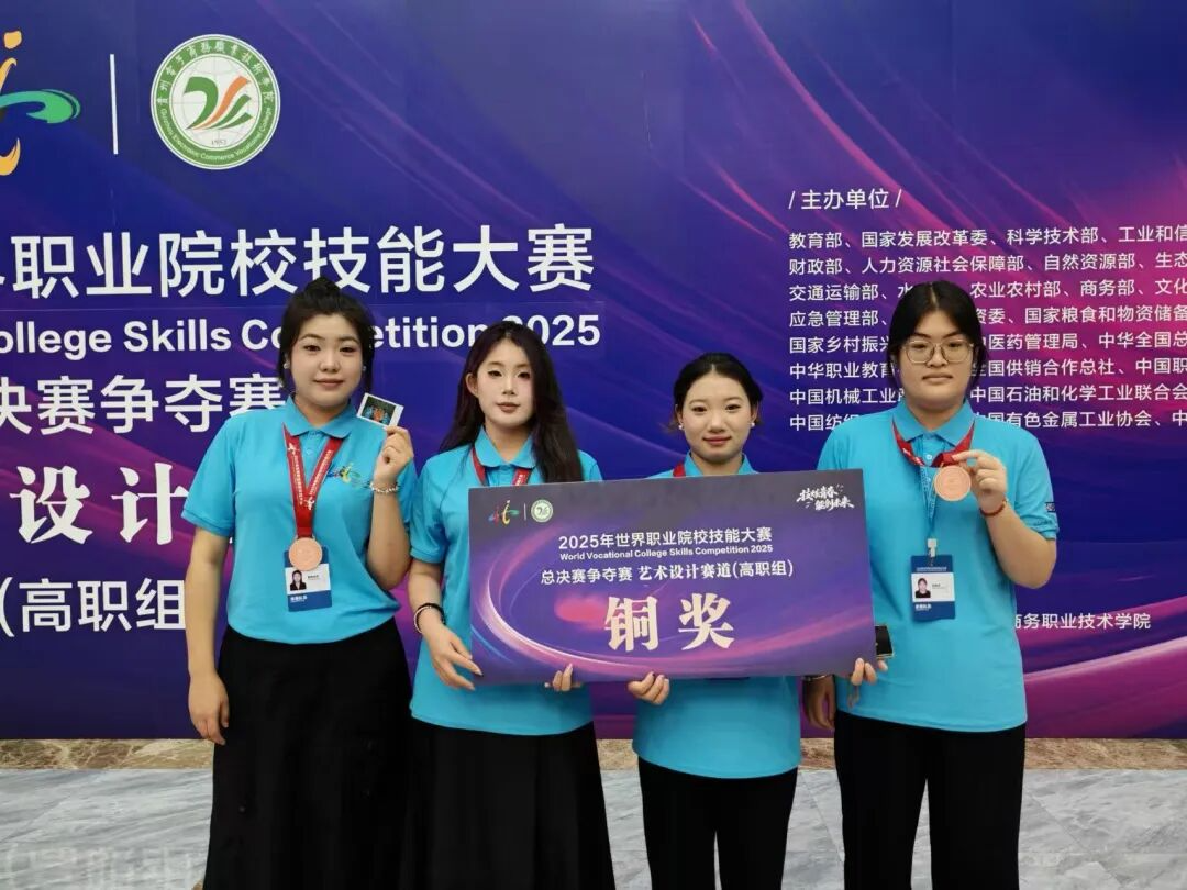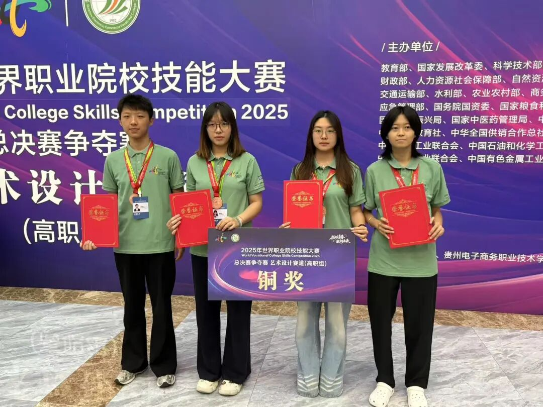 2025年8月31日上午,经过三天的激烈角逐,2025年世界职业院校技能大赛艺术设计赛道(高职组)总决赛在贵州电子商务职业技术学院圆满落幕。本次大赛吸引了来自全国各省、自治区、直辖市的200支代表队,共计800余名选手同台竞技。我院派出的两支代表队表现优异,由杨槟、唐宽欣老师指导,覃西央宗、范宇卿、李瀚文、田浩然组成的广告艺术设计队,以及由成琨、王岩老师指导,陈保策、杨雅雯、赵家玉、樊可欣组成的环境艺术设计队,凭借出色的综合实力与创新表现,双双摘得艺术设计赛道视觉设计赛项和环境艺术设计赛项铜牌,为学校赢得了荣誉,充分展现了我院在艺术设计教育方面的深厚底蕴与人才培养的显著成效。