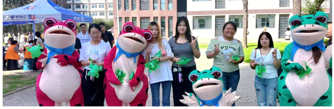 几个憨态可掬的小青蛙人偶蹦蹦跳跳地穿梭在人群里,“同学,快来领个气球!还有隐藏小惊喜哦!”原来,除了气球还有其他神秘礼品,每一份礼物都承载着学院对新生的满满心意!