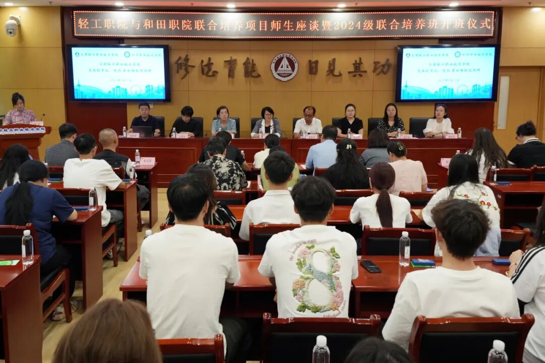 新利18平台与和田职业技术学院联合培养项目2024 级电子商务、服装设计与工艺专业联合培养班开班仪式举行。天津轻工职业学院党委副书记、院长李云梅,和田职业技术学院党委委员、副院长耿铁军及两校院系负责人、教师代表及联合培养班全体新老学生共同出席了仪式,开班典礼由校企合作与培训部部长白洁主持。