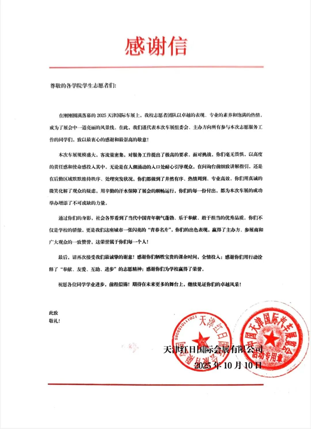 凭借同学们的出色表现与全心付出,此次志愿工作赢得了各方的高度认可,中国国际贸易促进委员会汽车行业分会给予了高度评价,天津红日国际会展有限公司也向同学们表达了诚挚谢意。此次合作为进一步拓展校企合作内涵与形式积累了宝贵经验。