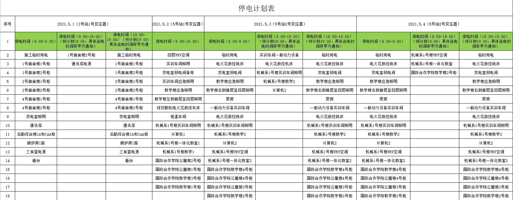 因我院产教融合工程中心和学生生活设施增建项目2号、5号变电站改造施工需要,五一放假期间(5月1日-5月4日)将对学院部分区域进行停电,停电安排如下,请涉及停电各部门提前做好工作安排。