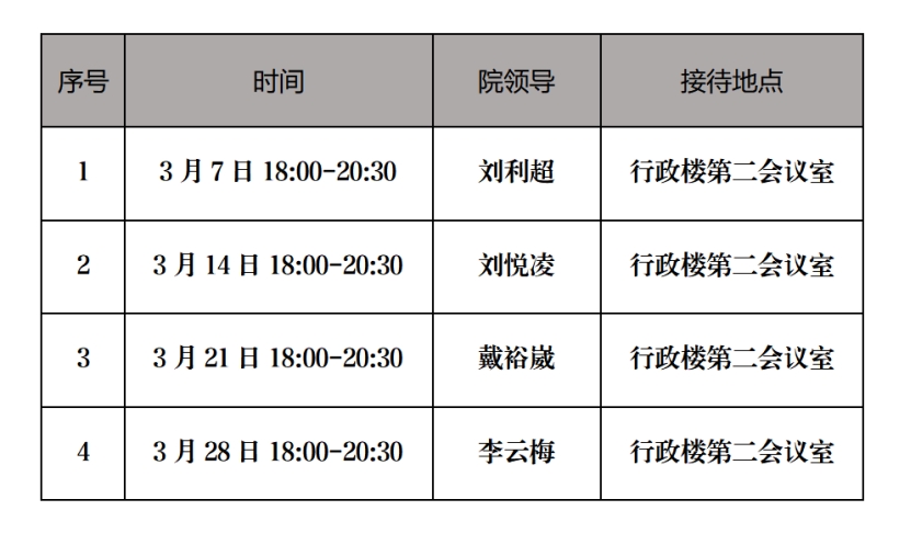 根据学院《院领导接待日管理办法》,现将2023年3月院领导接待日安排通知如下: