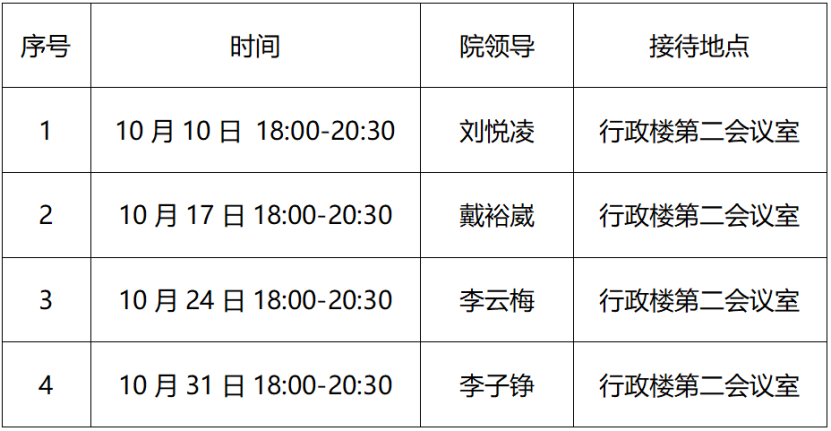根据学院《院领导接待日管理办法》,现将2023年10月院领导接待日安排通知如下: